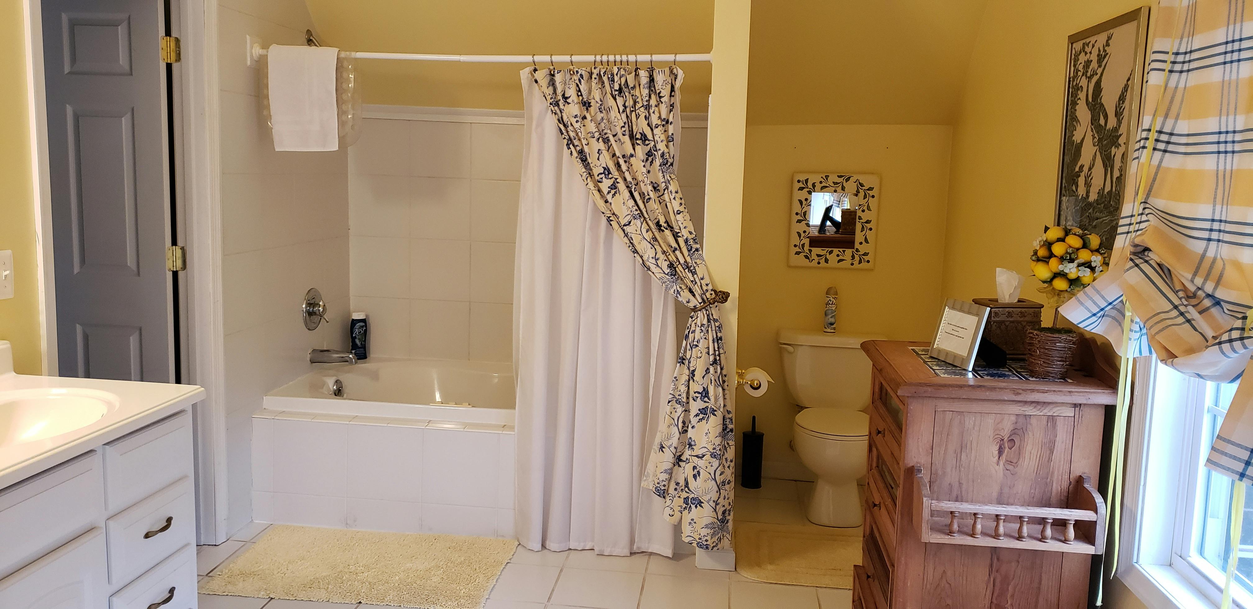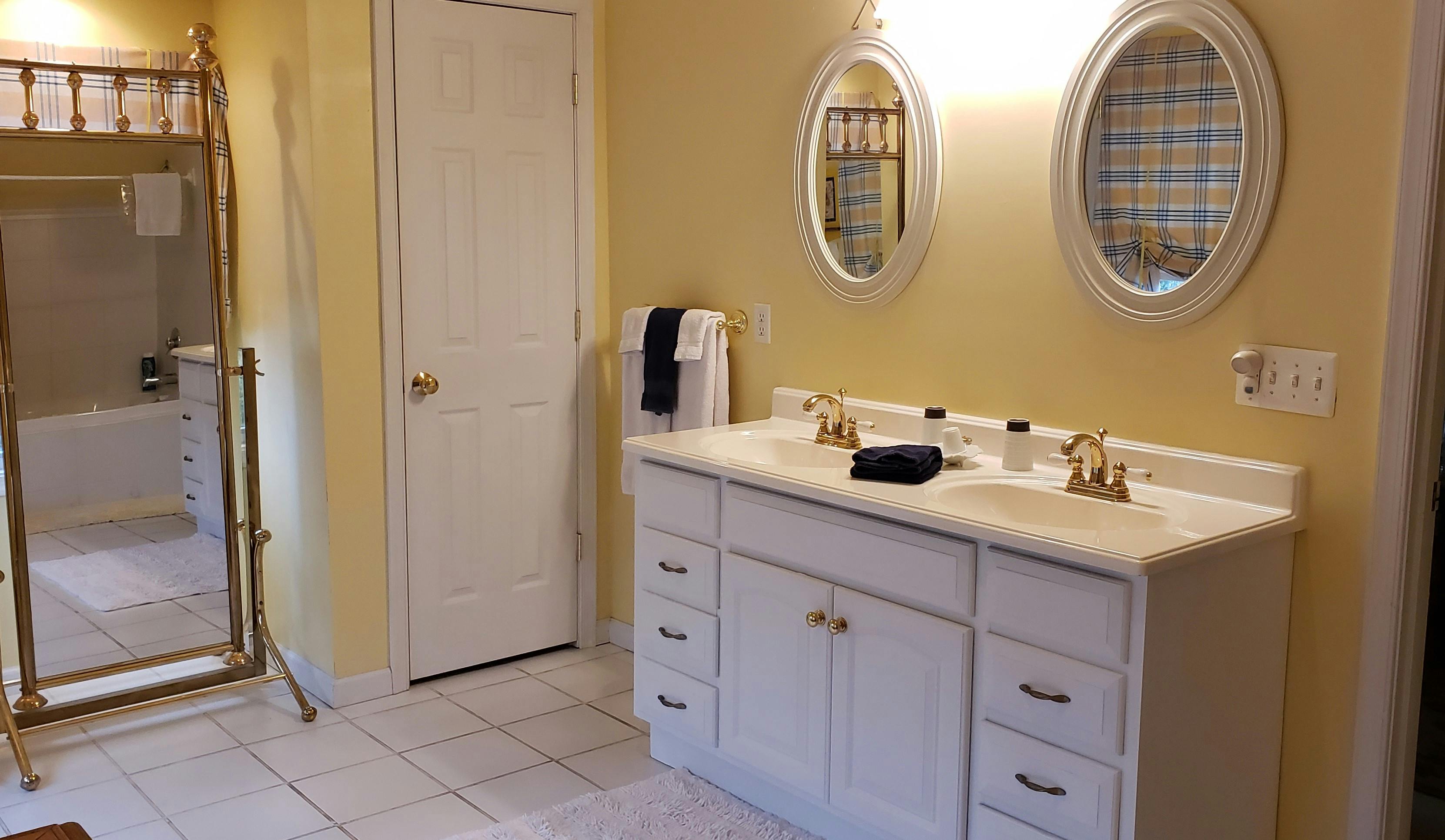A large 2 bed-room suite with a Queen master and Two-Full Size beds in the front room. A spacious double sink, double closet bathroom with tub shower. TVs in both rooms, Smart TV only in Master. Bathroom located in Master. Bright and spacious located on second floor with staircase required.