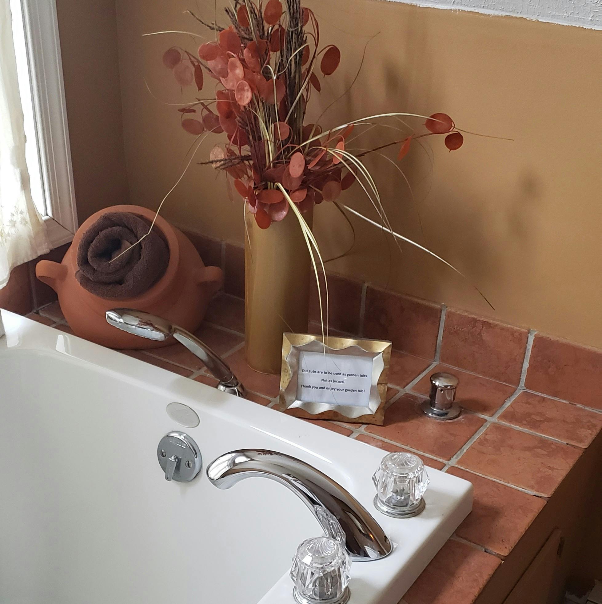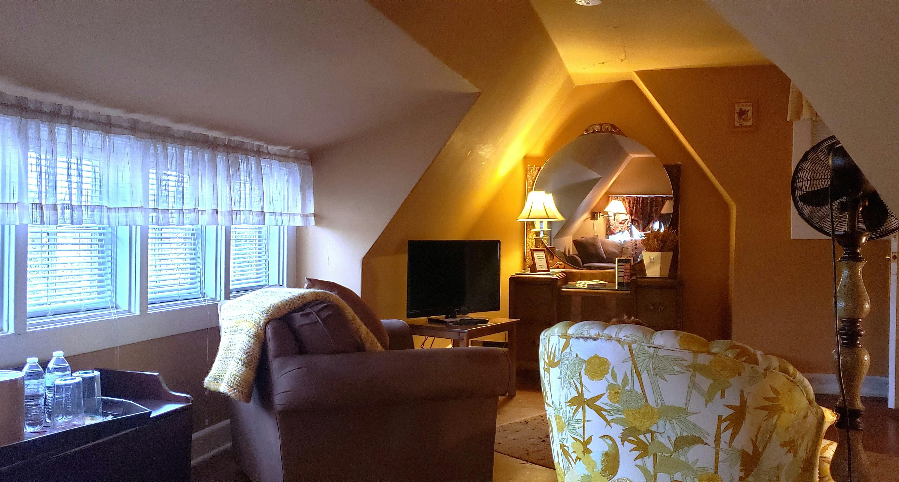 A unique addition to the home. Entrance is up a spiral staircase and offers a Queen bed and Queen size pull out sofa bed. The modern bathroom offers a sunken tub and hand held shower. Pets and Service Animals are allowed in this room with prior approval. SmarTV only, privately controlled heat and AC. Note only access is via the spiral staircase. Room does connect to the Mint Room for Family or Adjoining rooms. Free WiFI