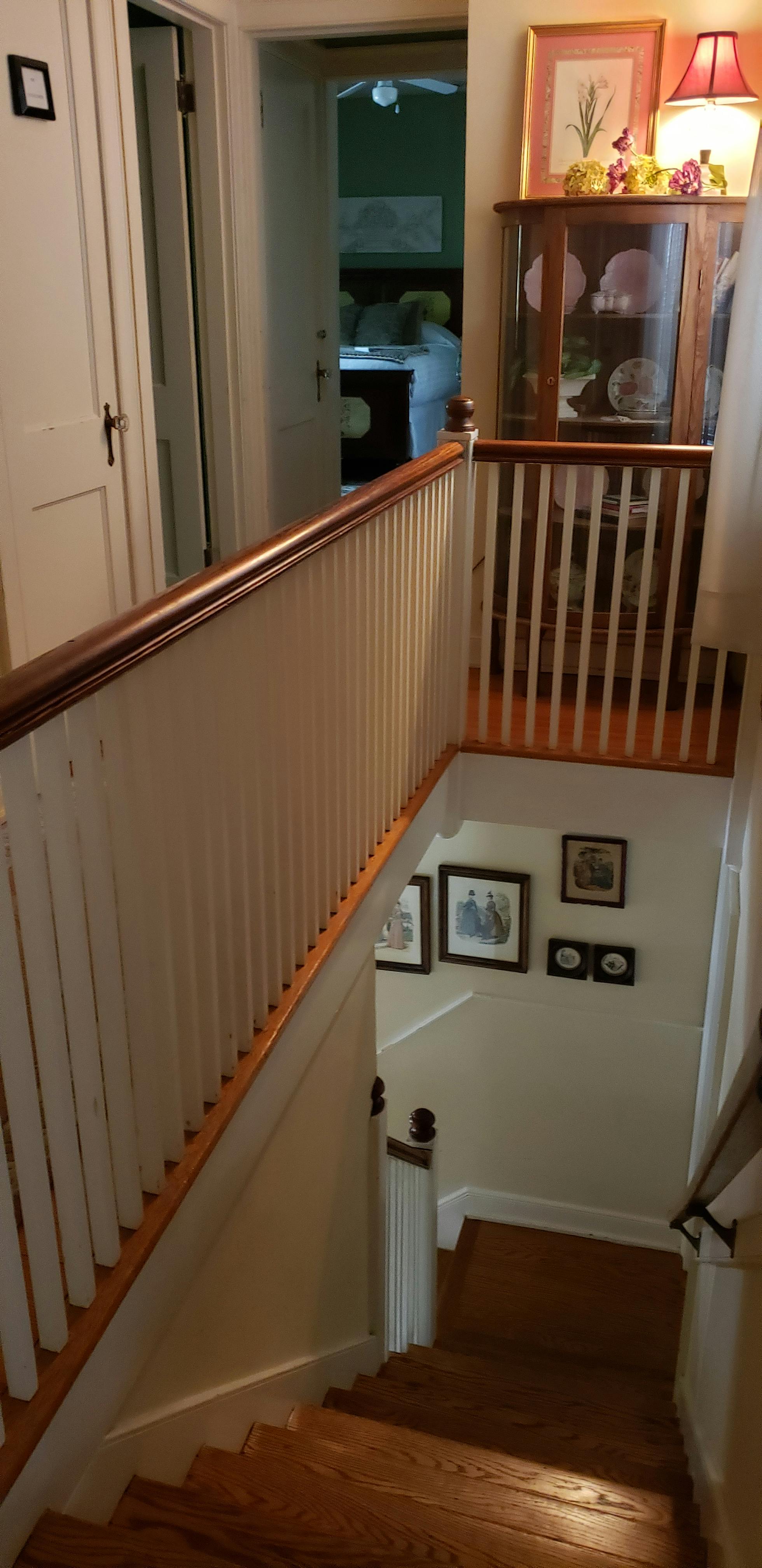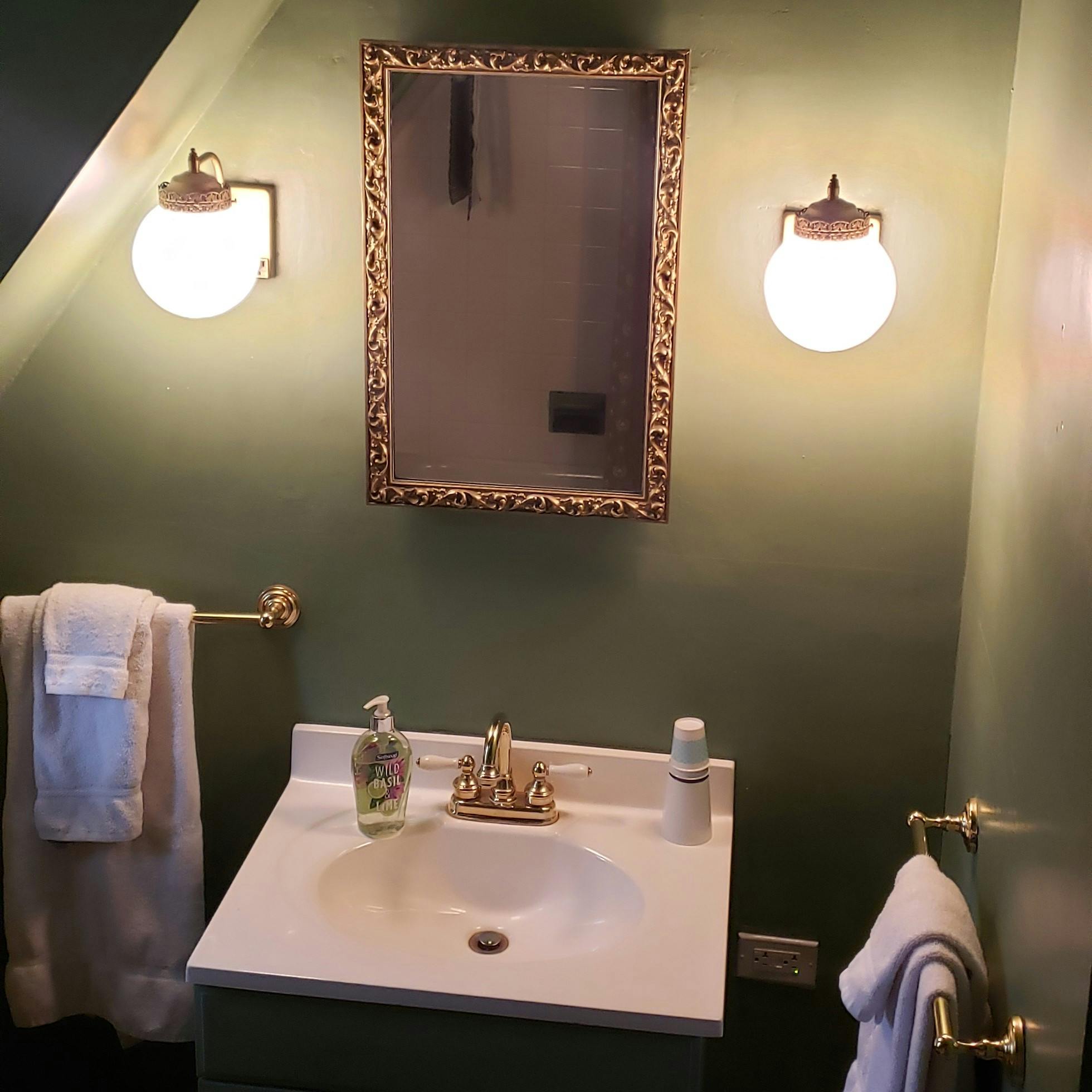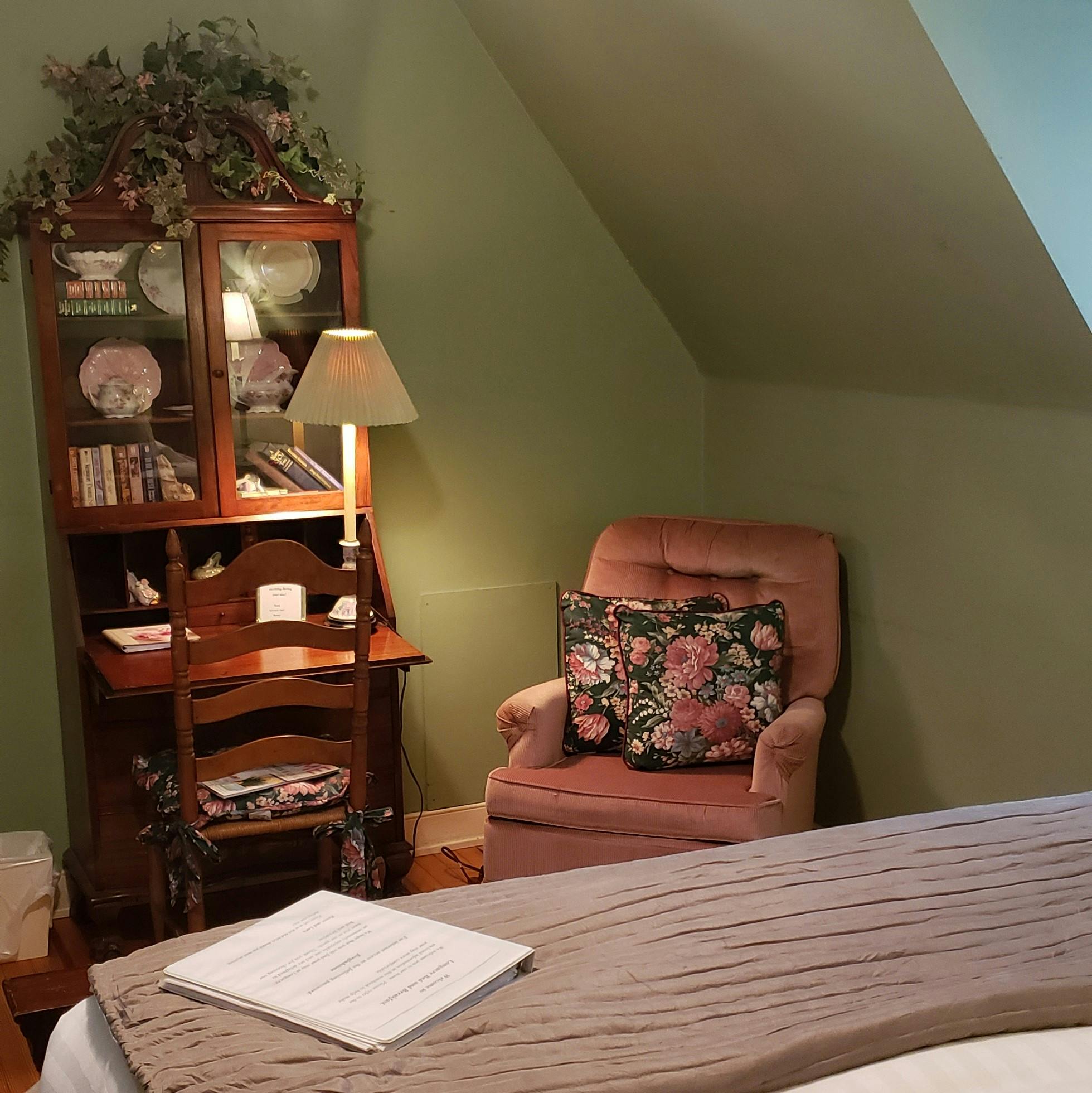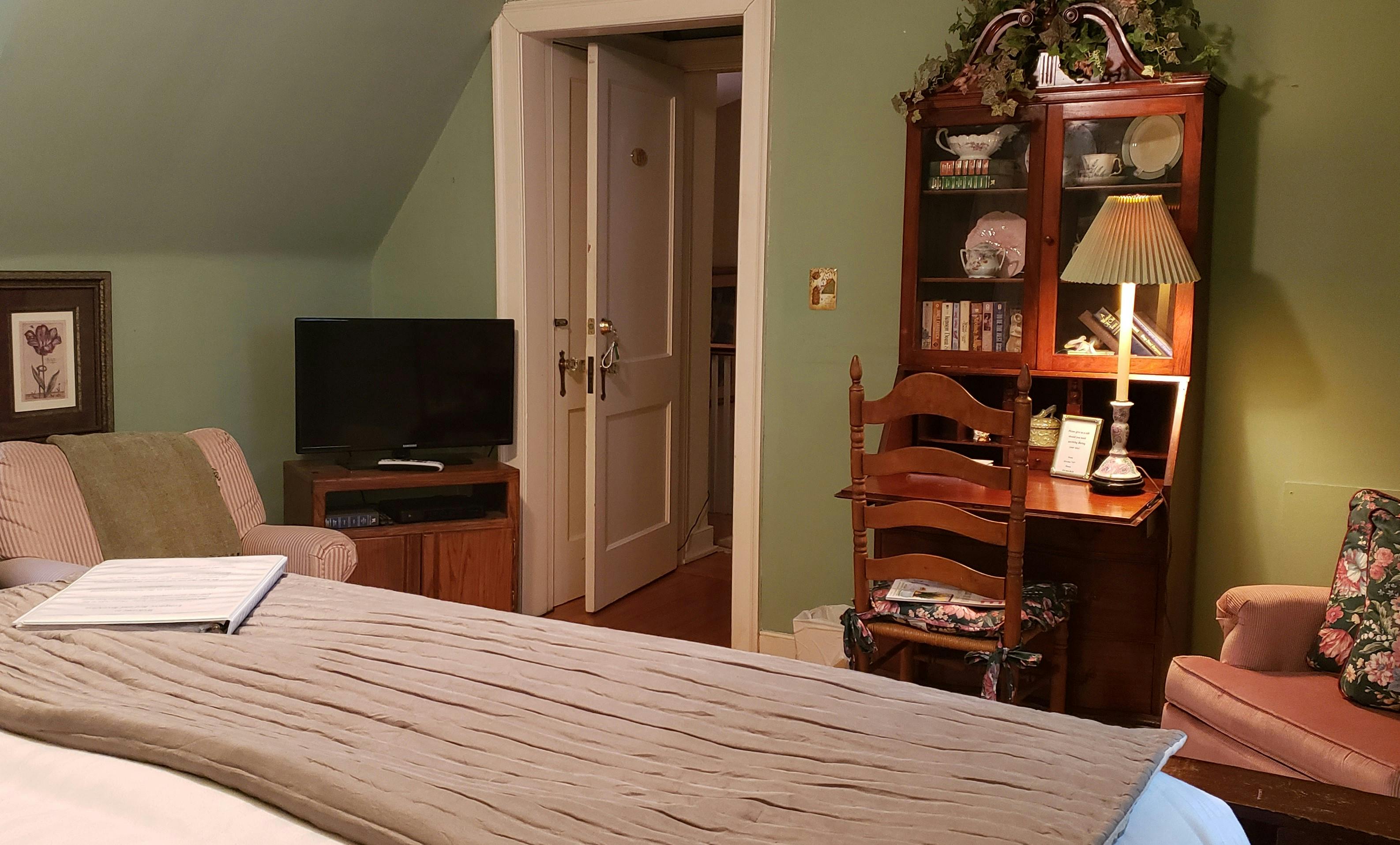 A cozy classic Queen room on the second floor. Private bath is located just outside the room entrance but is exclusive to the Mint guest room. Small windows overlooking front and back of property. Antique writing desk, Cable TV and Free Wifi. Room Adjoins to the Maple Room for Families or adjoining parties.